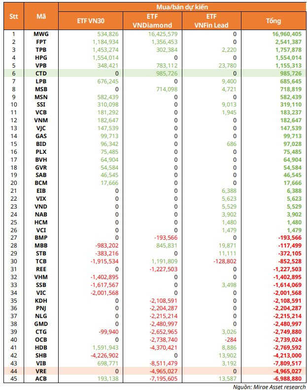 Ở chiều mua vào, các quỹ ETF tham chiếu rổ chỉ số VNDiamond có thể mua hơn 16 triệu cổ phiếu MWG nhằm gia tăng tỷ trọng. FPT, TPB, HPG, VPB… cũng có thể được “gom” mạnh trong đợt cơ cấu này. Cổ phiếu CTD có thể được mua vào hơn 985 nghìn đơn vị nếu lọt rổ chỉ số kim cương.
