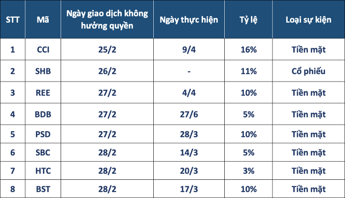 Ngày đăng ký cuối cùng là 28/2, tương ứng ngày giao dịch không hưởng quyền là 27/2. Ngày thanh toán dự kiến là 28/3.