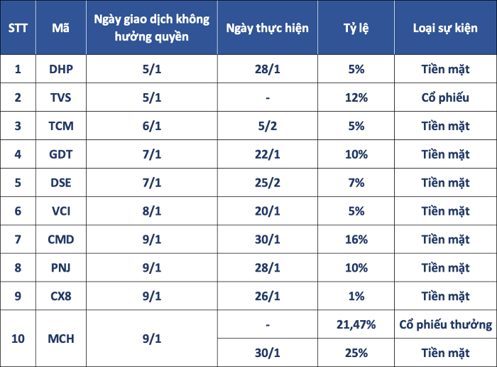 Trong tuần từ 5/1 đến 9/1, thị trường chứng khoán có 10 doanh nghiệp chốt ngày giao dịch không hưởng quyền để nhận cổ tức tiền mặt, cổ phiếu.