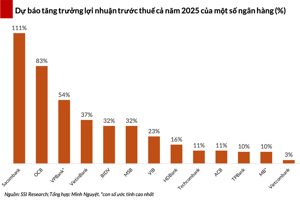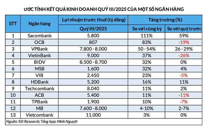 SSI dự báo Sacombank là nhà băng ghi nhận lợi nhuận quý III tăng trưởng lên tới ba con số so với cùng kỳ. Một số đại diện khác như OCB, VPBank, VietinBank, BIDV, MSB dự phóng lãi trước thuế quý III tăng trưởng trên 30% so với cùng kỳ.