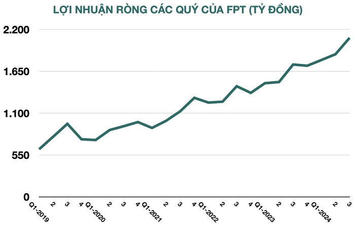 Tính riêng quý III, FPT báo lãi ròng kỷ lục 2.089 tỷ đồng, tăng 20% so với quý III/2023 và cũng là lần đầu tiên tập đoàn vượt 2.000 tỷ lợi nhuận trong một quý.