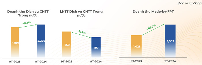 Nhờ đẩy mạnh hợp tác với khối chính phủ, bộ ban ngành và thúc đẩy mảng kinh doanh Điện toán đám mây và Trí tuệ nhân tạo cho các doanh nghiệp trong nước, mảng dịch vụ CNTT trong nước ghi nhận doanh thu đạt 5.296 tỷ đồng (tăng hơn 8%) và lãi trước thuế đạt 197 tỷ đồng (giảm 21% so với cùng kỳ).
