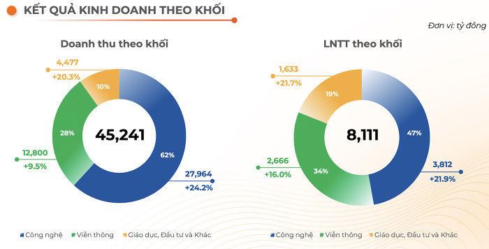 Năm 2024, tập đoàn đặt mục tiêu doanh thu 61.850 tỷ đồng, lợi nhuận trước thuế 10.875 tỷ đồng. Như vậy, sau 9 tháng, FPT thực hiện được hơn 73% chỉ tiêu doanh thu và 75% lợi nhuận năm.
