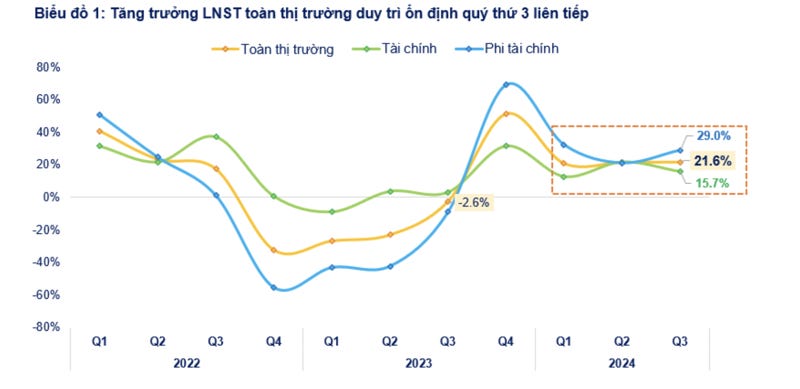 Tổng lợi nhuận sau thuế toàn thị trường trong quý 3/2024 tăng 21,6% so với cùng kỳ năm 2023, duy trì tốc độ ổn định so với 2 quý trước đó tăng 20,7% so với cùng kỳ trong quý 1 và tăng 21,4% trong quý 2.