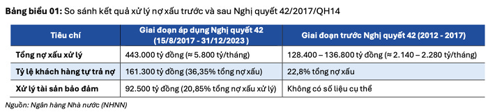 Dẫn số liệu từ báo cáo FiinGroup, trong giai đoạn áp dụng Nghị quyết 42 (15/8/2017-31/12/2023), toàn hệ thống đã xử lý khoảng 443.800 tỷ đồng nợ xấu theo Nghị quyết 42 (không gồm nợ xấu xử lý bằng dự phòng rủi ro), bình quân 5.800 tỷ đồng/tháng, cao gấp 2,5 lần giai đoạn 2012- 2017 (2.200 tỷ đồng/tháng), cùng với tỷ lệ khách hàng tự trả nợ tăng từ 22,8% lên 36,4%.