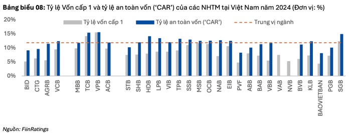 Theo quan sát của FiinRatings, năm 2024 cho thấy bộ đệm vốn cấp 1 còn mỏng và phân hóa rõ rệt; chỉ một số ít ngân hàng thương mại tư nhân đạt mức vốn cấp 1 cao, trong khi nhiều ngân hàng nhà nước và quy mô nhỏ vẫn đối diện áp lực đáng kể trong việc nâng vốn để đáp ứng Basel III. Từ đó, đặt ra yêu cầu cao hơn đối với năng lực vốn và thanh khoản cho hệ thống ngân hàng Việt Nam.