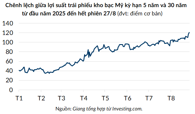 Chênh lệch giữa lợi suất trái phiếu kho bạc kỳ hạn 5 năm và 30 năm cũng đang nới rộng. Trong phiên 26/8, một ngày sau thông báo sa thải của ông Trump, mức chênh lệch đã tăng thêm 7 bps lên 117 bps - đánh dấu mức cao nhất kể từ năm 2021.