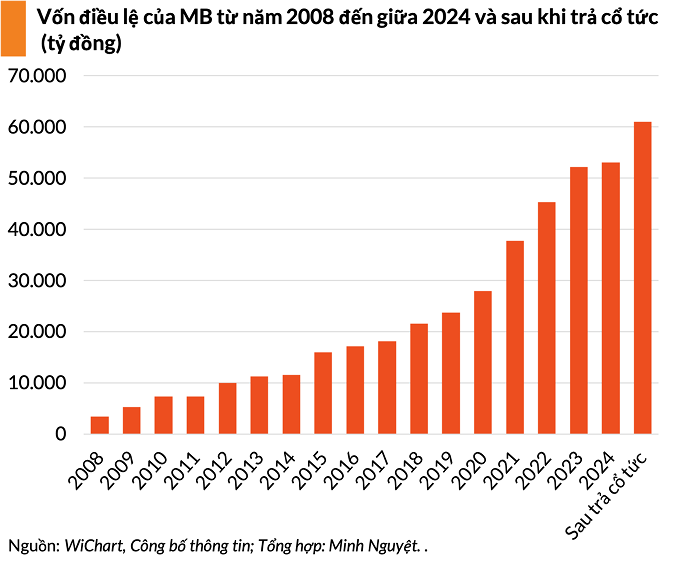 Sau khi phát hành gần 796 triệu cổ phiếu để chi trả cổ tức cho cổ đông hiện hữu, vốn điều lệ của MB đã tăng lên hơn 61.022 tỷ đồng.