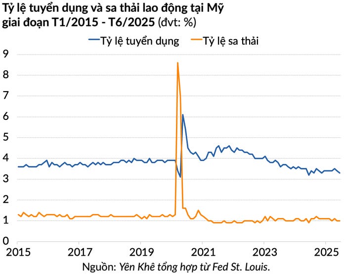 Tốc độ tuyển dụng đã chững lại đáng kể. Theo Bộ Lao động Mỹ, vào tháng 6, tỷ lệ tuyển dụng - số người được tuyển dụng so với tổng số việc làm - chỉ đạt 3,3%.