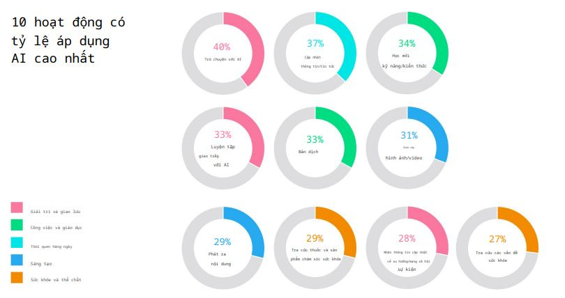 Theo đó, ChatGPT được người dùng Việt Nam sử dụng như một công cụ đa năng; Gemini và DeepSeek là bạn đồng hành học tập, Copilot chủ yếu được sử dụng để tìm kiếm thông tin; Meta được ưu tiên cho các cuộc trò chuyện hàng ngày; và AI Hay kết hợp giáo dục và giải trí, được sử dụng nhiều nhất cho việc học tập và cập nhật xu hướng.