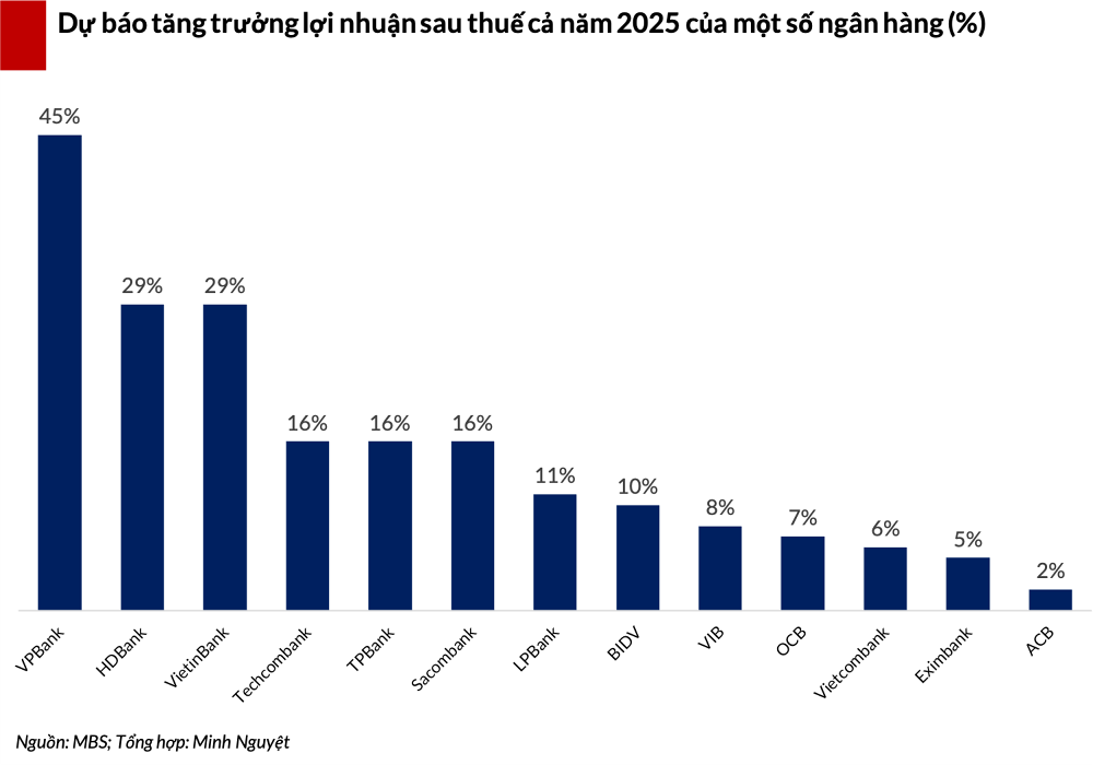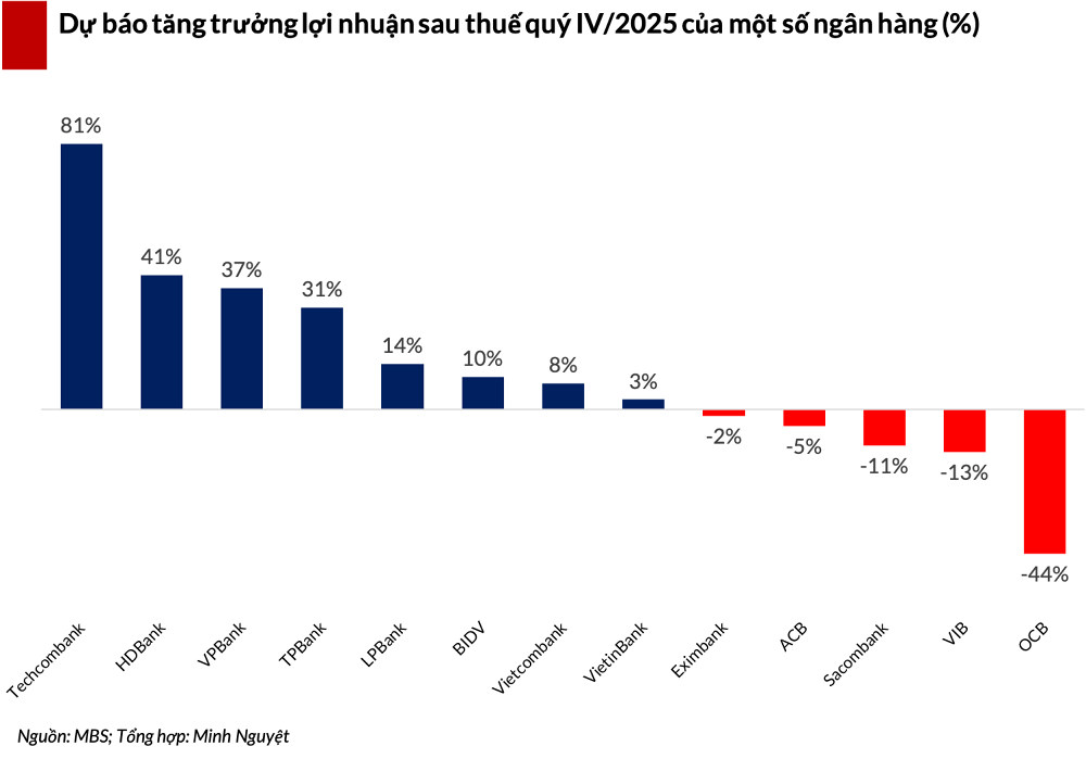 Theo dự báo của MBS, lợi nhuận sau thuế quý IV của các ngân hàng theo dõi sẽ tăng khoảng 13% so với cùng kỳ, đưa mức tăng trưởng lợi nhuận sau thuế của cả năm 2025 đạt xấp xỉ 16% so với cùng kỳ. Những ngân hàng được dự báo có mức tăng lợi nhuận sau thuế nhờ tăng trưởng tín dụng cao trong quý như HDBank, Techcombank, VPBank, TPBank.