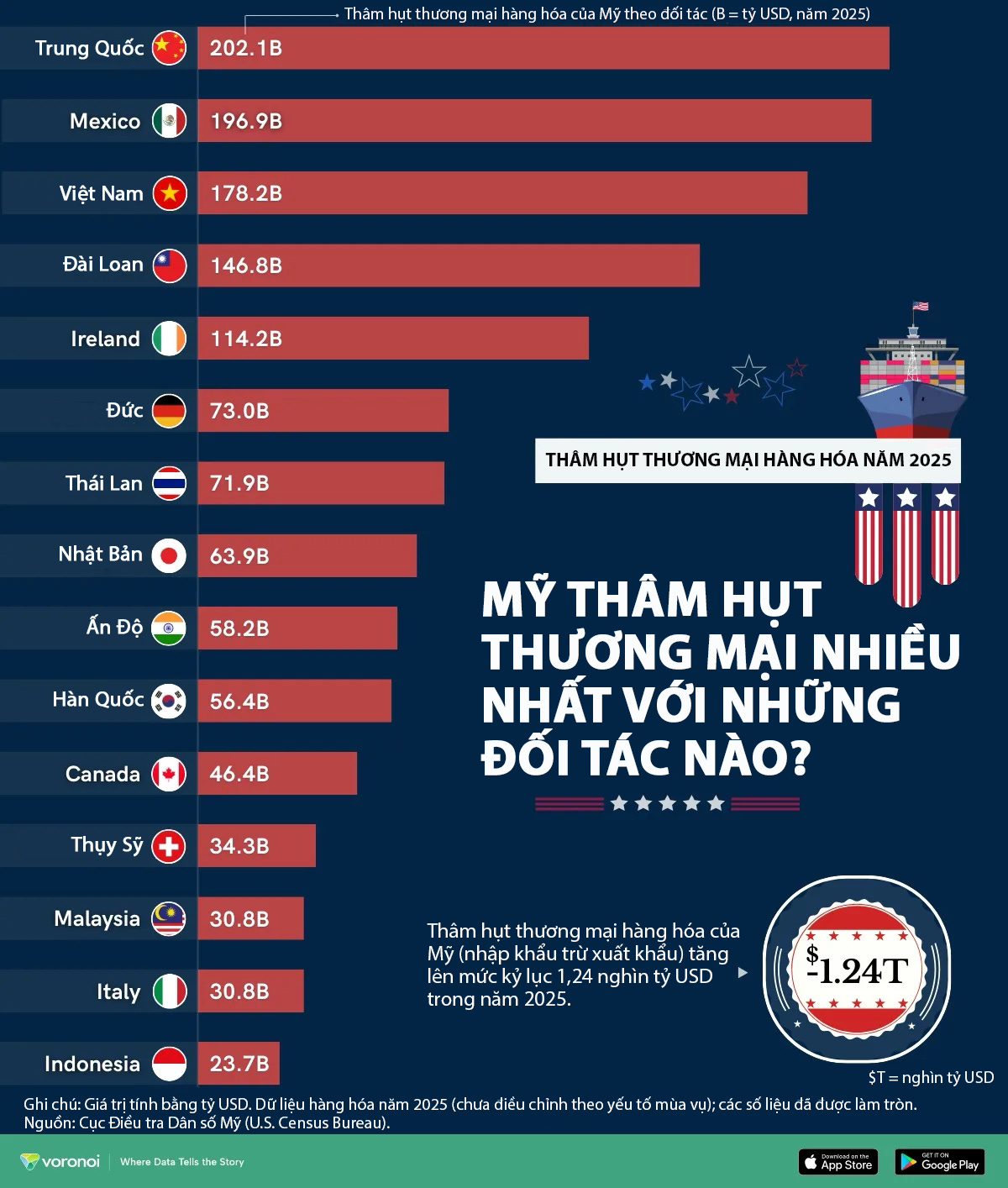 Trung Quốc đứng đầu danh sách các đối tác mà Mỹ có thâm hụt thương mại hàng hóa nhiều nhất trong năm 2025, với mức thâm hụt 202,1 tỷ USD. Xếp ngay sau là Mexico với 196,9 tỷ USD và Việt Nam với 178,2 tỷ USD. Chỉ riêng ba nền kinh tế này chiếm 46% tổng thâm hụt thương mại hàng hóa của Mỹ năm ngoái.