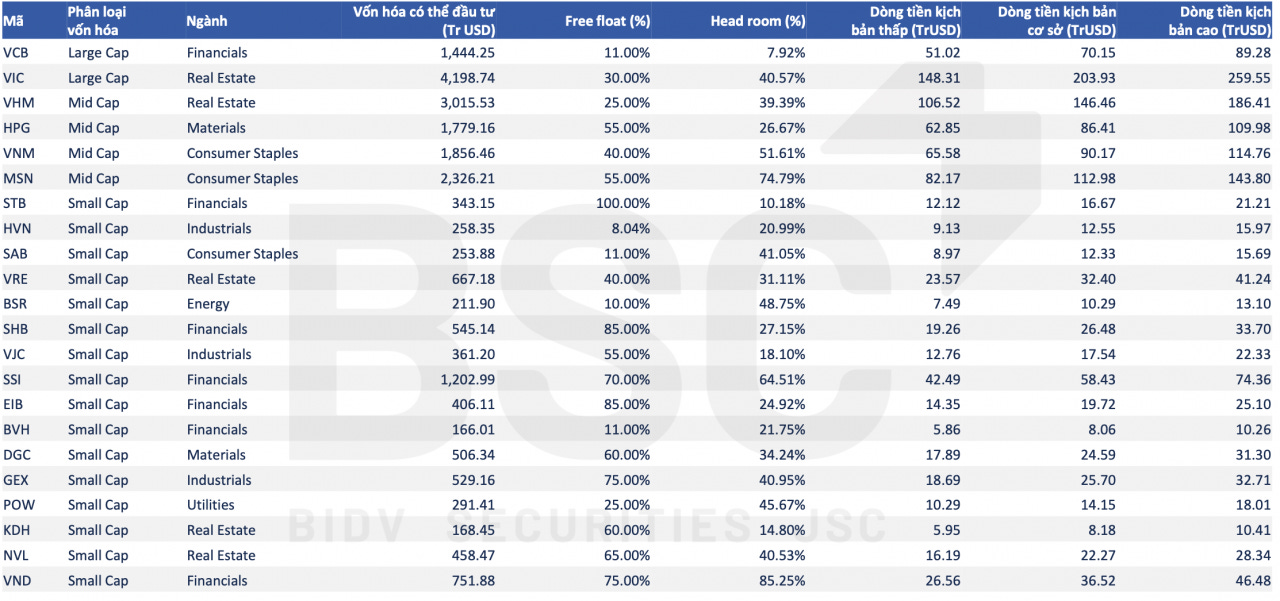 Nhóm cổ phiếu Small Cap cũng có nhiều cái tên đáng chú ý như SSI, SHB, STB, VRE, BSR, VJC hay VND... Dòng vốn từ các quỹ ETF tham chiếu chỉ số FTSE Emerging Market dự kiến trong khoảng 20 - 60 triệu USD mỗi mã. Trong đó, SSI được ước tính có thể hút gần 58 triệu USD ở kịch bản cơ sở. Lợi thế của cổ phiếu này còn đến từ khoảng trống “room” ngoại lớn, tạo dư địa lớn cho các quỹ mới mở vị thế.