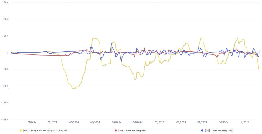 Như vậy, Ngân hàng Nhà nước hút ròng 71.447,96 tỷ đồng từ thị trường trong tuần qua bằng kênh thị trường mở. Có 13.999,93 tỷ đồng lưu hành trên kênh cầm cố, có 85.453 tỷ đồng tín phiếu Ngân hàng Nhà nước lưu hành trên thị trường.