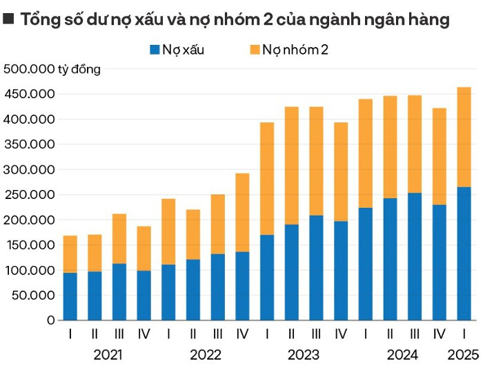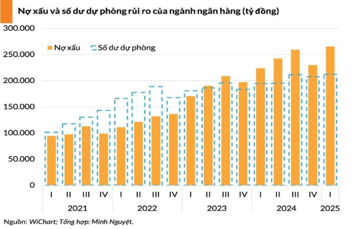 Theo dữ liệu ngành của Wichart, trong quý đầu năm, số dư nợ xấu (nợ từ nhóm 3 đến nhóm 5) của ngành ngân hàng đã bất ngờ tăng thêm gần 17% so với cuối năm 2024, lên 265.549 tỷ đồng. Đây là mức nợ xấu cao kỷ lục của ngành ngân hàng.