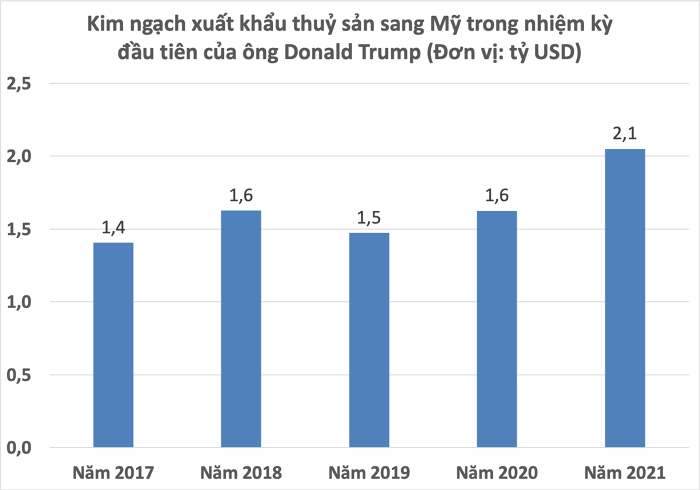 Nhìn lại quá khứ ở nhiệm kỳ trước của ông Trump, kim ngạch xuất khẩu thuỷ sản của Việt Nam sang Mỹ nhìn chung tăng trưởng. Duy nhất, năm 2019 kim ngạch giảm 6,6% so với năm 2018 do ảnh hưởng bởi đại dịch COVID-19.