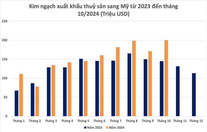 Trong năm nay, xuất khẩu thuỷ sản sang Mỹ duy trì đà phục hồi. Theo Hiệp hội Chế biến và Xuất khẩu Thuỷ sản (VASEP), tính tới cuối tháng 10, xuất khẩu thủy sản Việt Nam sang Mỹ đã đạt 1,5 tỷ USD, tăng 15% so với cùng kỳ năm ngoái. Ước tính cả năm 2024, xuất khẩu thủy sản sang Mỹ sẽ mang về 1,85 tỷ USD, tăng 19% so với năm 2023.