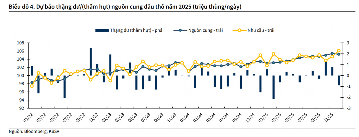 Dự báo thặng dư hoặc thâm hụt nguồn cung dầu thô toàn cầu năm 2025 (triệu thùng/ngày). Nguồn: Bloomberg, KBSV Research.