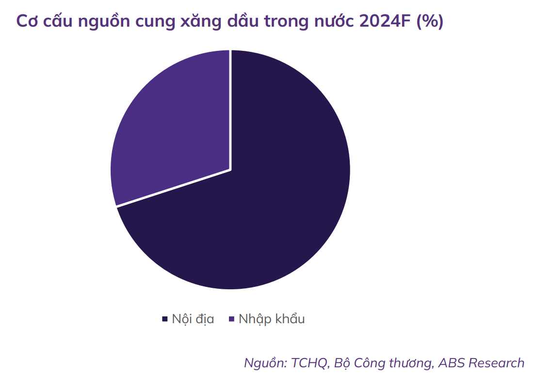 Cơ cấu nguồn cung xăng dầu trong nước năm 2024F (%). Nguồn: TCHQ, Bộ Công Thương, ABS Research.