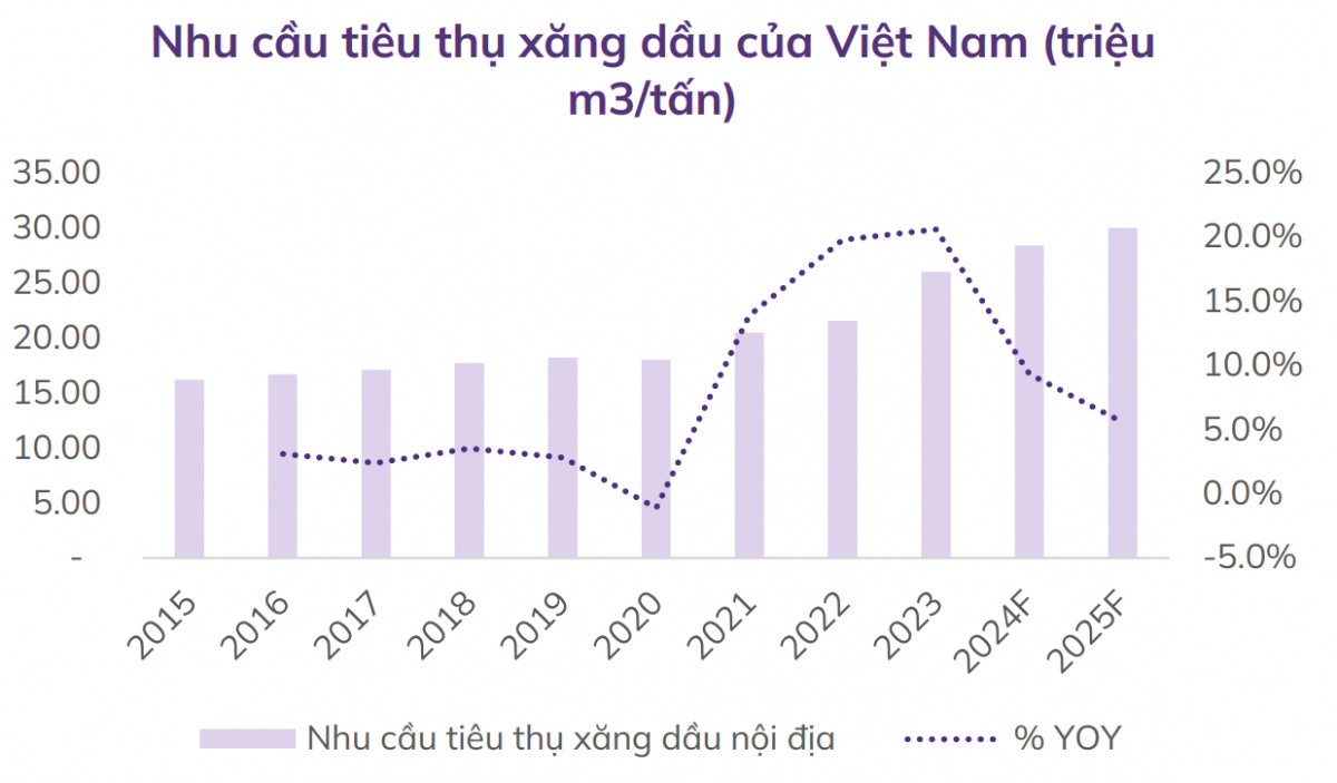 Thị trường xăng dầu Việt Nam bước vào năm 2025 với nhiều biến động mạnh mẽ. Theo Khối Phân tích, CTCP Chứng khoán An Bình (ABS Research), tổng nhu cầu tiêu thụ xăng dầu tại Việt Nam trong năm 2024 dự kiến đạt 28,4 triệu m³/tấn, tăng 9% so với cùng kỳ năm trước.