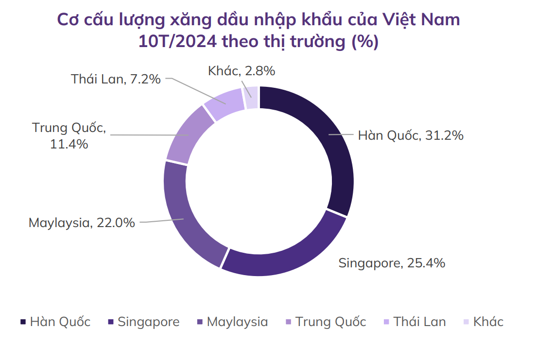 Cơ cấu nhập khẩu xăng dầu của Việt Nam 10 tháng đầu năm 2024 theo thị trường (%). Nguồn: ABS Research.