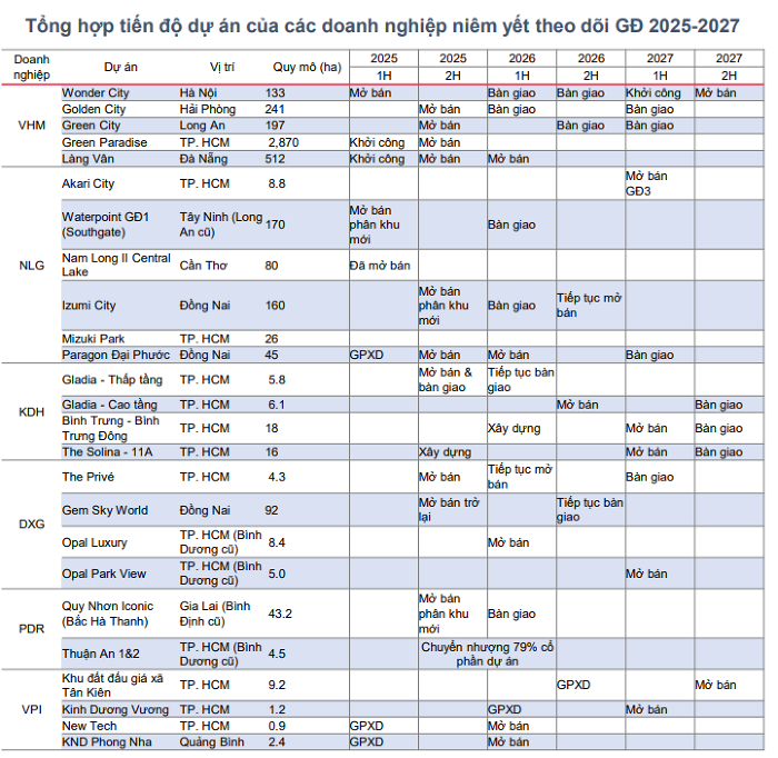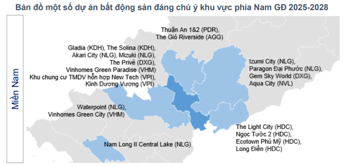 Trong khi đó tại khu vực phía Nam, MBS dự báo trong giai đoạn 2025- 2026, vốn đầu tư mới cho các dự án bất động sản chủ yếu tập trung tại TP HCM, với sự tham gia của nhiều doanh nghiệp niêm yết lớn.