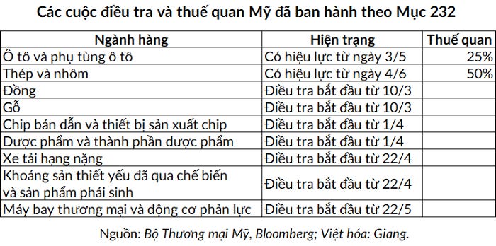 Dự kiến trong vài tuần tới, Bộ Thương mại Mỹ sẽ công bố kết quả cuộc điều tra vào các ngành hàng quan trọng với an ninh quốc gia, bao gồm chip bán dẫn, dược phẩm và khoáng sản thiết yếu. Đông đảo chuyên gia dự kiến các cuộc điều tra sẽ mở đường để Mỹ ban hành thuế quan mới theo Mục 232 của Đạo luật Mở rộng Thương mại.