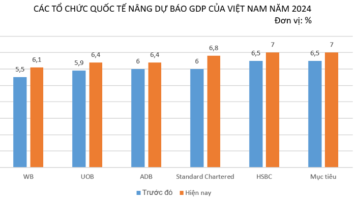 Ngân hàng HSBC vừa nâng dự báo tăng trưởng 2024 của Việt Nam lên 7% tương đương với mục tiêu đề ra (6,5 - 7%), trong khi Ngân hàng Standard Chartered điều chỉnh con số này từ 6,0% lên 6,8%; ADB và UOB cùng nâng kỳ vọng lên 6,4% và còn Ngân hàng Thế giới (WB) lên mức 6,1% từ 5,5% trước đó.