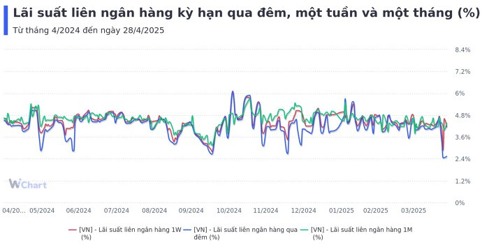Theo dữ liệu từ Cục Dự trữ Liên bang Mỹ (Fed) chi nhánh New York, chênh lệch giữa lãi suất qua đêm có bảo đảm (SOFR) của Mỹ và lãi suất qua đêm tại Việt Nam tại phiên 28/4 là 1,82 điểm %.