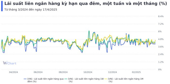 Trên thị trường liên ngân hàng, lãi suất kỳ hạn qua đêm không biến động quá mạnh, bắt đầu ở mốc 4,06% vào phiên đầu tuần (ngày 14/4), giảm xuống 4,02% trong phiên sau đó, trước khi phục hồi lên 4,07% tại ngày 17/4.