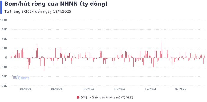 Trên kênh tín phiếu không ghi nhận giao dịch khi nhà điều hành đã ngừng phát hành tín phiếu từ ngày 5/3. Tổng cộng trong tuần qua (từ 14/4-18/4), NHNN đã hút ròng 8.356 tỷ đồng khi lượng lớn giấy tờ có giá đáo hạn.