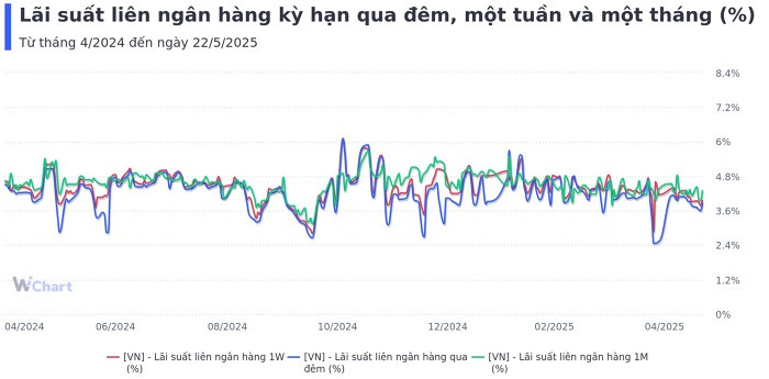Trên thị trường liên ngân hàng, lãi suất kỳ hạn qua đêm bắt đầu ở mốc 3,71% vào phiên đầu tuần và giảm dần qua các phiên xuống 3,6% tại ngày 21/5, trước khi phục hồi lên 3,86% vào phiên 22/5.
