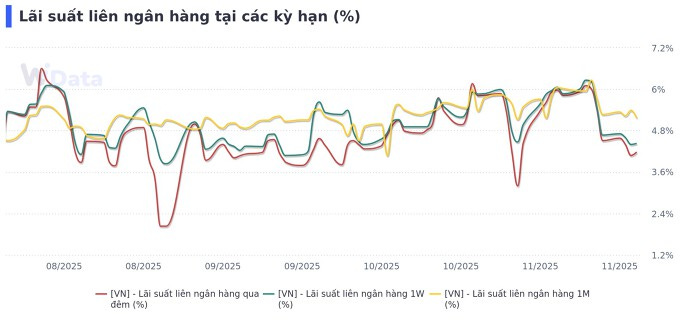 Trong tuần, lãi suất qua đêm có xu hướng giảm, bắt đầu từ mốc 4,58% vào đầu tuần và giảm dần qua các phiên, ghi nhận mức 4,08% tại phiên 19/11, trước khi tăng lên 4,18% tại ngày 20/11.