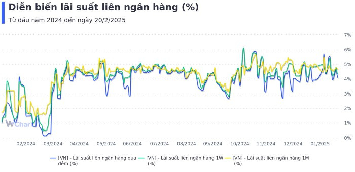 Trên thị trường liên ngân hàng, lãi suất qua đêm có xu hướng giảm trong tuần qua (trừ phiên 18/2), giảm từ mốc 4,48% vào đầu tuần về mức 4,08% vào ngày 20/2, trong khi lãi suất các kỳ hạn từ một tuần tới một tháng hiện dao động từ 4,37% - 4,65%, đều hạ nhiệt so với ghi nhận trong phiên đầu tuần trong khoảng 4,61% - 4,67%.