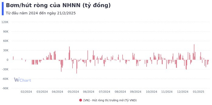 Trên kênh tín phiếu, ngân hàng đã phát hành 21.700 tỷ đồng tín phiếu trong tuần từ 17/2-21/2, tuy nhiên có gần 19.600 tỷ đồng tín phiếu đáo hạn, do đó lượng hút ròng qua kênh này khoảng 2.100 tỷ đồng.