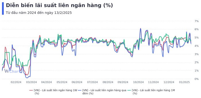 Trên thị trường liên ngân hàng, lãi suất qua đêm đã giảm từ mốc 5,54% vào đầu tuần về mức 4,25% vào ngày 13/2, trong khi lãi suất các kỳ hạn từ một tuần tới một tháng hiện dao động từ 4,45% - 4,67%, đều hạ nhiệt so với ghi nhận trong phiên đầu tuần (ngày 10/2).