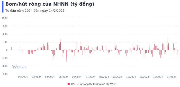 Trong tuần từ 10/2-14/2, Ngân hàng Nhà nước (NHNN) đã cho các thành viên vay tổng cộng gần 85.634 tỷ đồng với lãi suất 4% trên kênh cho vay cầm cố giấy tờ có giá. Cùng thời gian trên, khối lượng đáo hạn lên tới gần 121.139 tỷ đồng. Như vậy, tổng hút ròng qua kênh này lên tới 35.505 tỷ đồng.