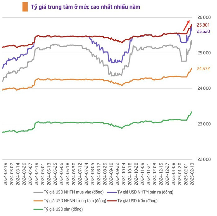 Nhận định về tỷ giá, chứng khoán Vietcap dự phóng một số yếu tố có thể gây áp lực lên tỷ giá USD/VND trong tháng 2/2025, bao gồm thanh khoản dồi dào trong hệ thống ngân hàng có thể làm giảm lãi suất liên ngân hàng và tạo áp lực lên tỷ giá USD/VND. Bên cạnh đó, ngày 11/2, NHNN đã tăng tỷ giá bán USD thêm 1% lên 25.698 từ mức 25.450, tạm dừng bán ngoại tệ và nhu cầu từ Kho bạc Nhà nước để thanh toán trái phiếu bằng USD.