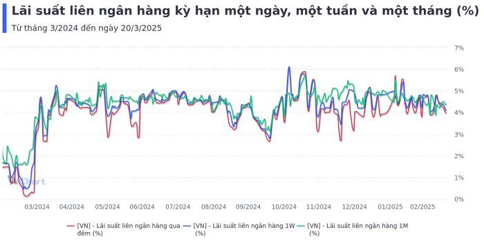 Trên thị trường liên ngân hàng, lãi suất qua đêm có xu hướng giảm trong tuần qua, lãi suất liên ngân hàng bắt đầu ở mốc 4,26% vào phiên đầu tuần (ngày 17/3) và giảm dần qua các phiên xuống 3,97% tại ngày 20/3, tổng cộng giảm 0,29 điểm %.