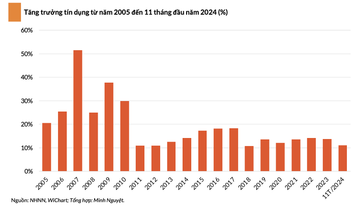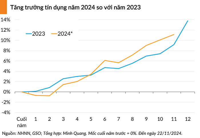 Động thái nới room tín dụng cho các ngân hàng cho thấy quyết tâm của nhà điều hành trong việc đẩy vốn ra nền kinh tế. Tính đến ngày 22/11/2024, tăng trưởng tín dụng toàn hệ thống đạt 11,12%, vẫn xa mục tiêu 15% đã đề ra đầu năm.