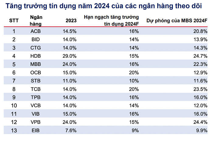 Dựa trên các dự báo đó, một số ngân hàng được MBS dự phóng tăng trưởng tín dụng cao trong năm 2024 như: HDBank (khoảng 24,7%); VPBank (24,4%); Techcombank (23,5%); MB (22,3%); ACB (20,8%).