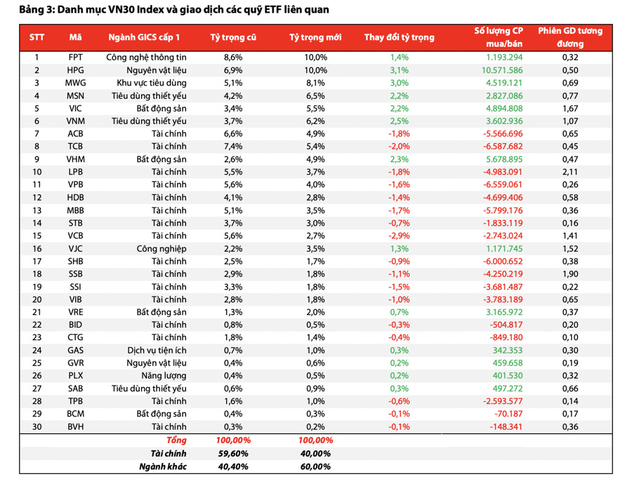 Tính đến ngày 31/03/2025, tỷ trọng của các cổ phiếu nhóm ngành Tài chính chiếm 60% tỷ trọng danh mục chỉ số VN30, do vậy ước tính tỷ trọng các cổ phiếu thuộc nhóm ngành này sẽ được điều chỉnh giảm trong đợt cơ cấu kỳ này. Theo đó, dòng vốn dự kiến sẽ được tái phân bổ cho các cổ phiếu thuộc nhóm ngành khác trong rổ VN30 mà không loại bỏ cổ phiếu hiện tại để thêm mới cổ phiếu khác.