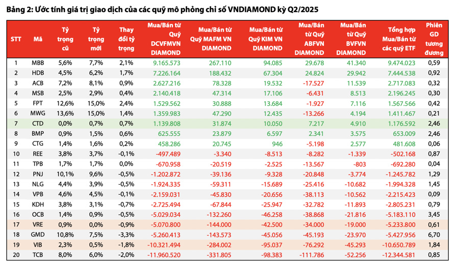 Ước tính các quỹ sẽ mua nhiều nhất 9,4 triệu cổ phiếu MBB, HDB được mua 7,4 triệu cổ phiếu, ACB được mua 2,7 triệu cổ; MSB được mua 2,2 triệu cổ; MWG và FPT được mua 1,4-1,5 triệu cổ, CTD được mua 1,1 triệu cổ. Ở chiều ngược lại, TCB bị bán ra nhiều nhất 12,3 triệu cổ; VIB bị bán ra 10,6 triệu cổ; GMD bị bán 5,4 triệu cổ; VRE bị bán 5,2 triệu cổ; OCB 5,1 triệu cổ; KDH 2,8 triệu cổ; VPB 2,2 triệu cổ; NLG 1,99 triệu cổ; PNJ 1,2 triệu cổ.