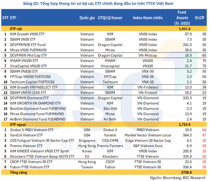 Thống kê trong báo cáo của BSC Research cho thấy tính đến giữa tháng 8/2025, thị trường Việt Nam đang có 18 ETF nội hoạt động, tham chiếu theo 7 bộ chỉ số VN30, VNMidcap, VN100, VN-Diamond, VNFinlead, VNFinselect và VNAllshare. Tổng quy mô tài sản của các ETF nội đạt mức 1.015,8 triệu USD.