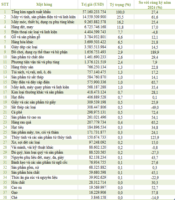 Có 10 mặt hàng đạt giá trị xuất khẩu trên 1 tỷ USD với tổng kim ngạch đạt 50,52 tỷ USD, chiếm 87,6% tổng kim ngạch xuất khẩu của Việt Nam sang Mỹ 5 tháng đầu năm 2025.