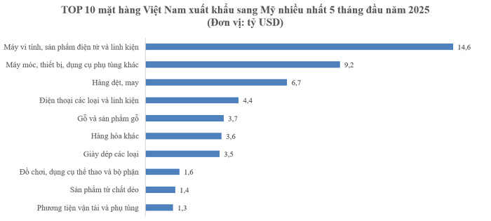 Trong 5 tháng đầu năm 2025, có 10 mặt hàng đạt giá trị xuất khẩu trên 1 tỷ USD với tổng kim ngạch đạt 50,52 tỷ USD, chiếm 87,6% tổng kim ngạch xuất khẩu của Việt Nam sang Mỹ.
