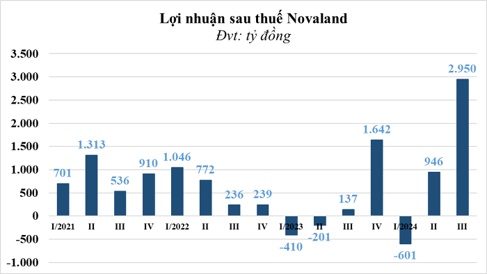 Theo báo cáo tài chính quý III, Novaland (Mã: NVL) ghi nhận doanh thu thuần hợp nhất hơn 2.010 tỷ đồng, tăng đến 87% so với cùng kỳ năm ngoái. Lợi nhuận sau thuế thu về gần 2.950 tỷ đồng, gấp gần 22 lần cùng kỳ và là mức lãi cao nhất trong một quý.