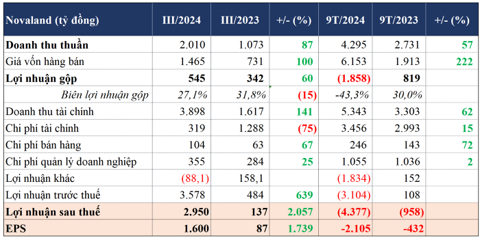 Lũy kế 9 tháng đầu năm, tổng doanh thu hợp nhất từ bán hàng và cung cấp dịch vụ của Novaland là 4.295 tỷ đồng. Riêng hoạt động bán hàng đóng góp gần 3.739 tỷ đồng, tăng 64% so với cùng kỳ năm ngoái nhờ việc bàn giao tại các dự án NovaWorld Phan Thiet, NovaWorld Ho Tram, Aqua City, Palm City...
