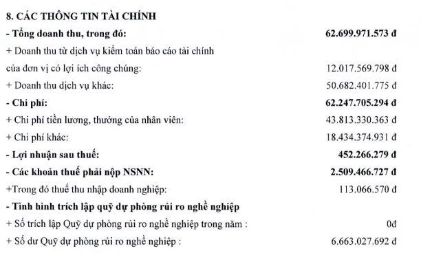 Năm 2023, Moore AISC ghi nhận doanh thu đạt mức 62,7 tỷ đồng. Trong đó doanh thu từ dịch vụ kiểm toán báo cáo tài chính của đơn vị có lợi ích công chúng là 12 tỷ đồng, còn lại gơn 50 tỷ là doanh thu tới từ các dịch vụ khác.