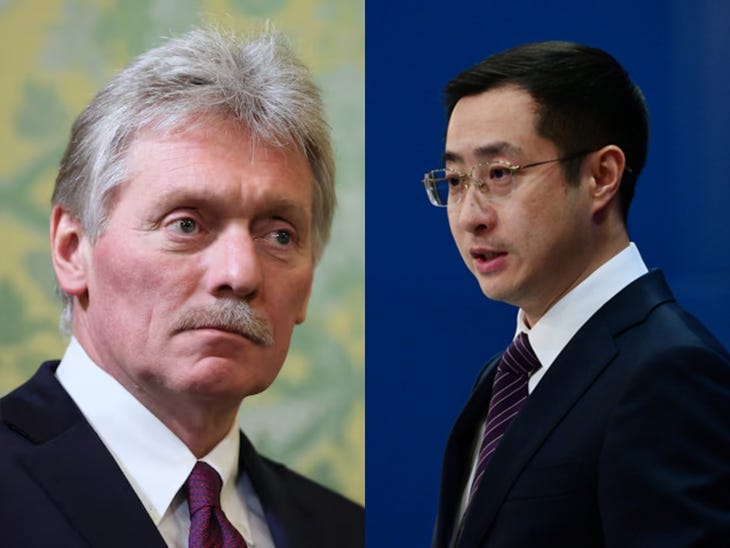 Người phát ngôn Điện Kremlin Dmitry Peskov (trái) và người phát ngôn Bộ Ngoại giao Trung Quốc Lâm Kiếm (phải) - Ảnh: REUTERS